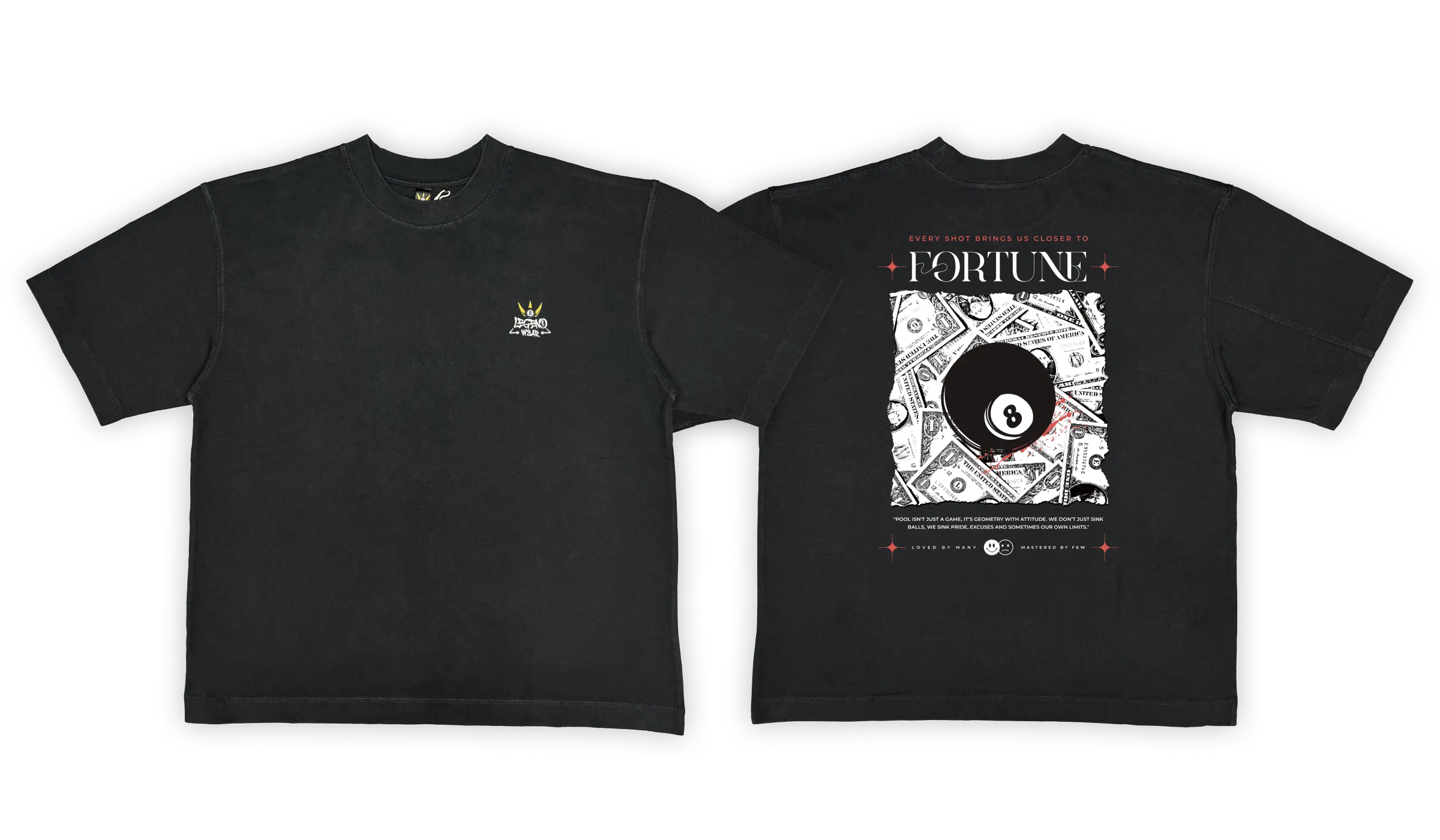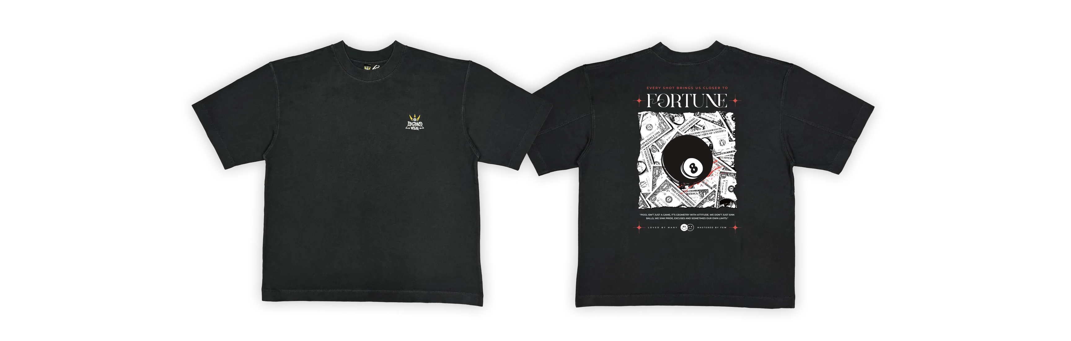 With bold 8 ball graphics, dollar bill–inspired elements, and the statement:“Every shot brings us closer to FORTUNE.” This piece captures the idea that every decision, every shot, every step adds up. Because on the table and in life, we’re not just chasing wins — we’re building something bigger.
